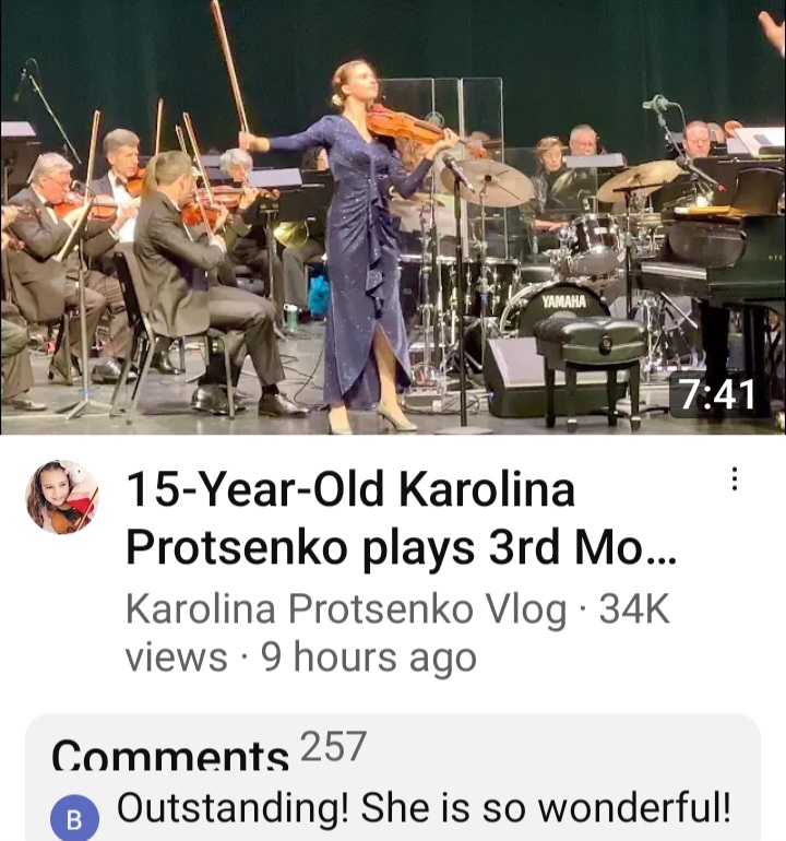 I hope she gets a scholarship to an ivy league school. Yale University has an amazing music program. I have met such fine musicians there, who are so very humble. I am not impressed with some things at that university, but I guarantee Karolina would have an amazing experience there. Maybe there is a better place for violinists. I just hope this young lady gets a full scholarship. She is very, very special and her parents are her best friends and that is magical. I cannot comebt on this device because Iam abused. I truly resent the cyber corruption.